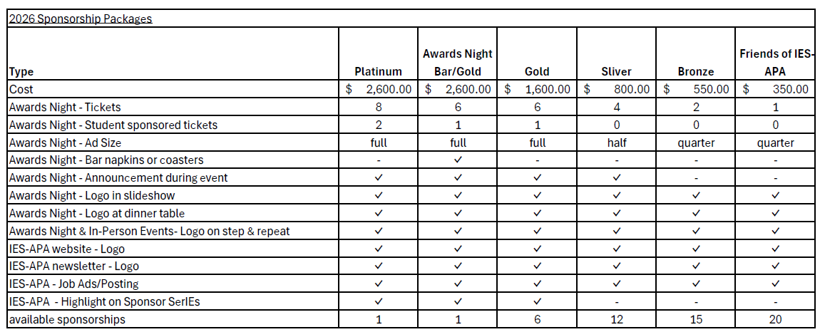 The IES-APA has a number of sponsorship opportunities available, including website advertisements, the Newsletter, as well as our annual Awards Program. Any questions, concerns, or inquiries about sponsorships can be directed to: Suzanne Peterson via email at speterson@gosbcta.com.